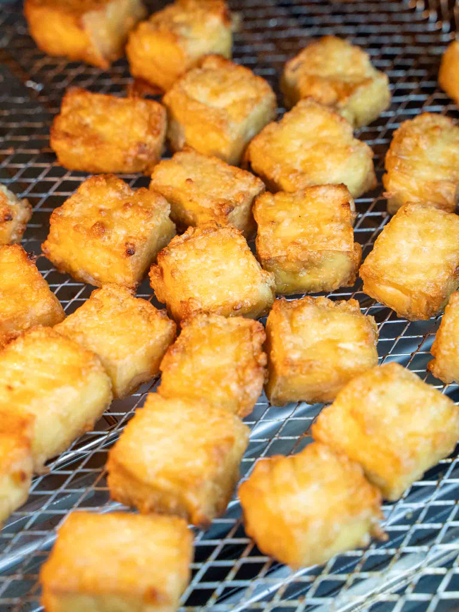 If you visit an Asian grocery store, you’ll see that there are so many varieties of Tofu with different textures. Ranging from silken tofu (which is very, very soft) to extra firm tofu. For Air Frying (or deep frying), extra firm tofu is the best. They are dense and don’t break very easily, and have a low amount of moisture.