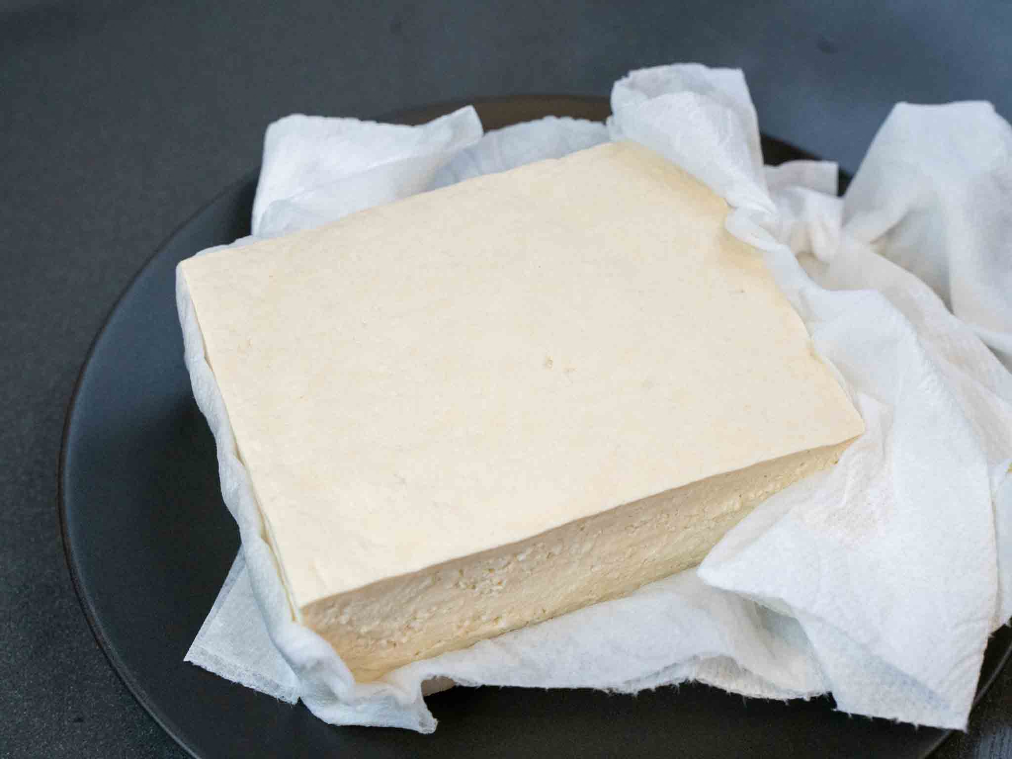 Place 2 – 3 folded paper towels over and under the tofu block. Put a plate on top and then place something heavy on the plate to press it down. I use my stone mortar and pestle. You can also use a heavy cast-iron skillet. Leave it for 15 – 30 minutes. This helps to get rid of most excess water and make the tofu firmer.