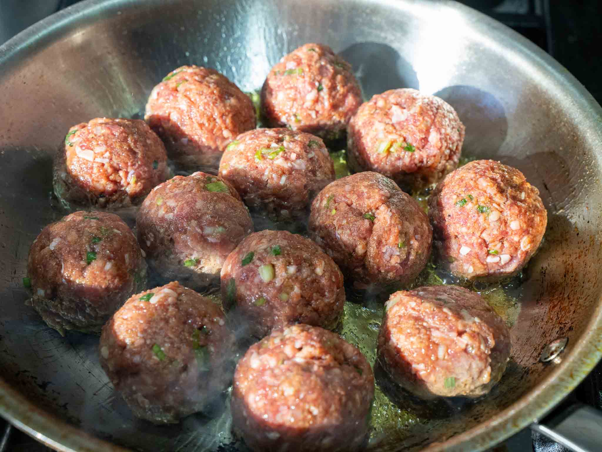 Bring a pan to medium heat. Add oil, and when the oil is heated, place the meatballs. Let them brown on one side first. Then turn them and fry until all the sides are brown and cooked through, turning them every few minutes. This will take about 8 minutes. When cooked, remove to a plate, let them rest for 5 minutes before serve.