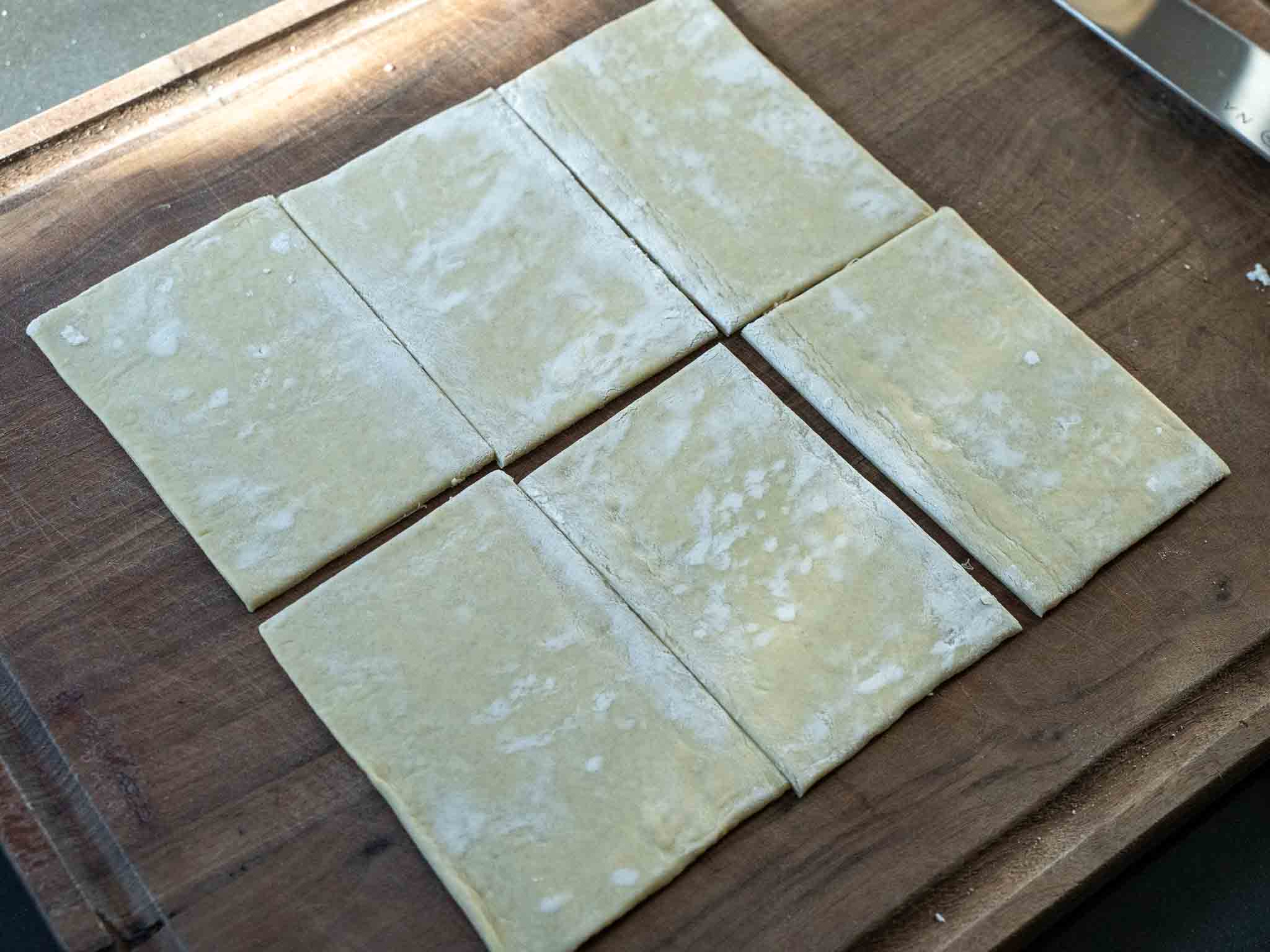 Cut the pastry sheet into 6 equal sized square or rectangular pieces.Â