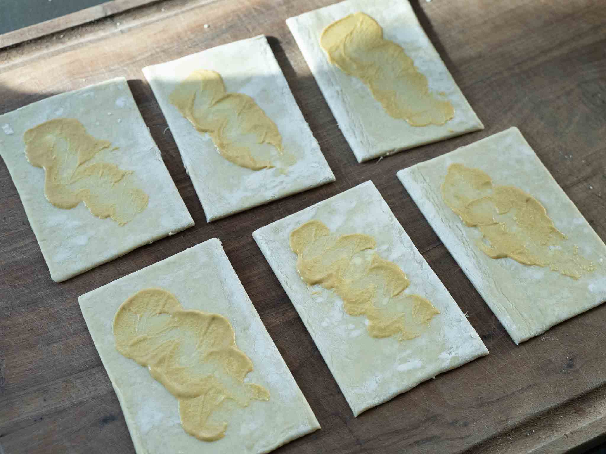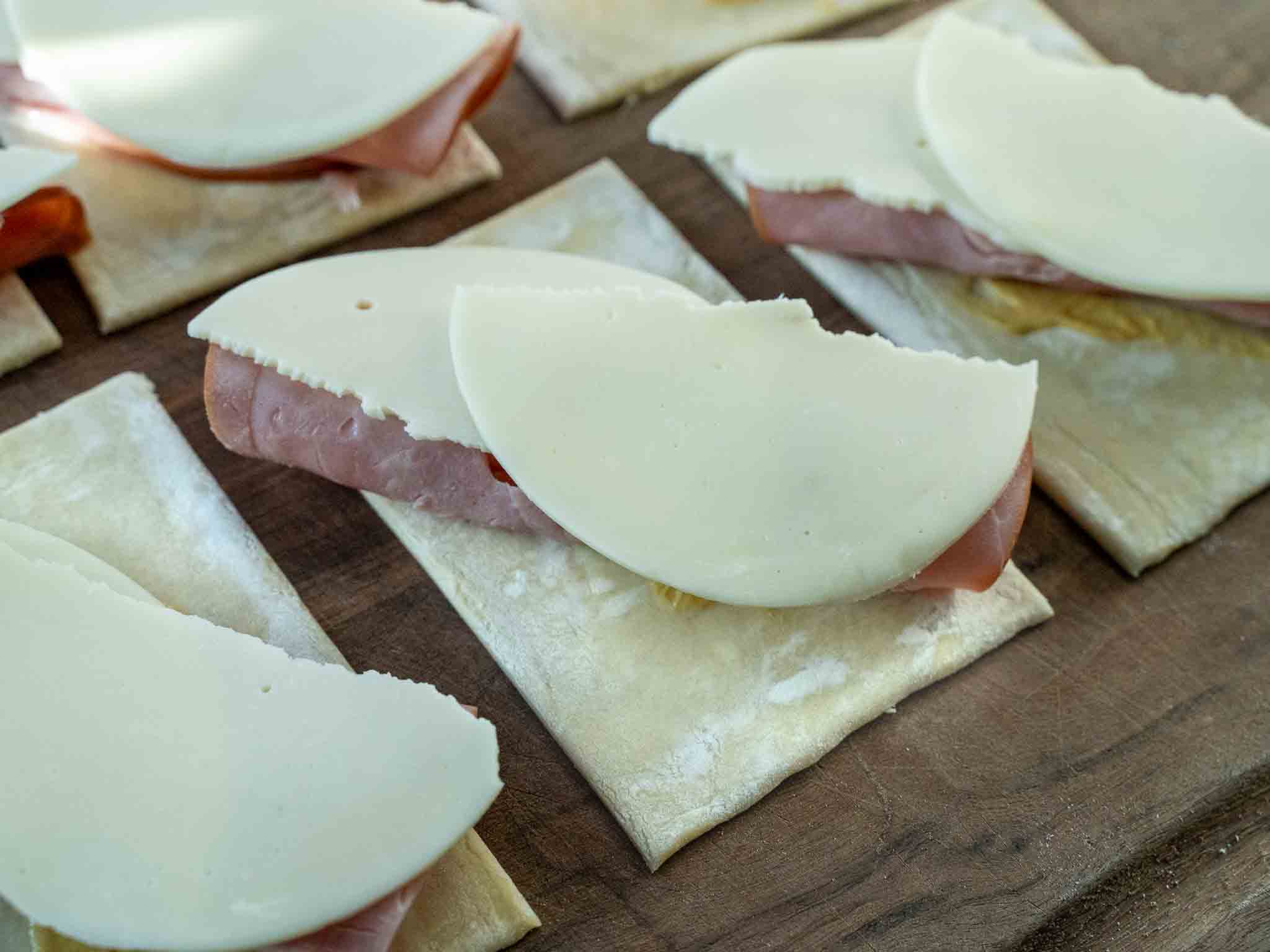 Optional: Add about 1/4 tsp of dijon mustard to each pastry. Spread it in the middle. (skip if you don't like mustard flavor)