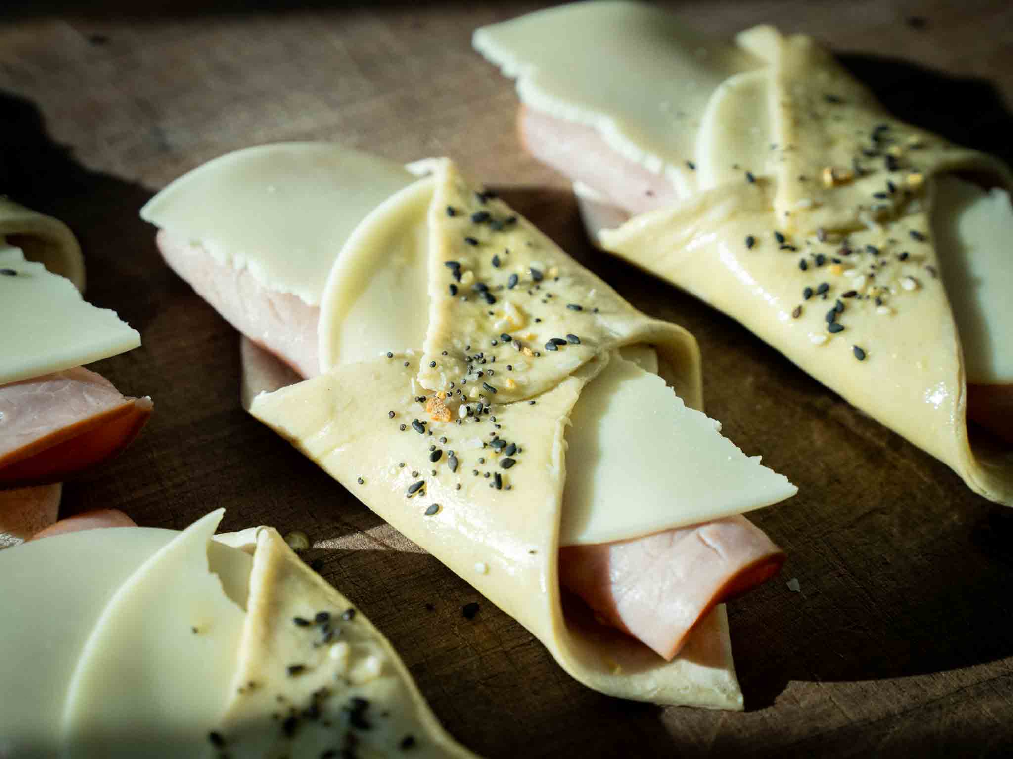 If you are making a bigger batch, you can keep a portion of the dough in the fridge until you fill the rest of it. And then refrigerate the pastries that you filled with ham and cheese, until you fill the rest of the puff pastry sheets.