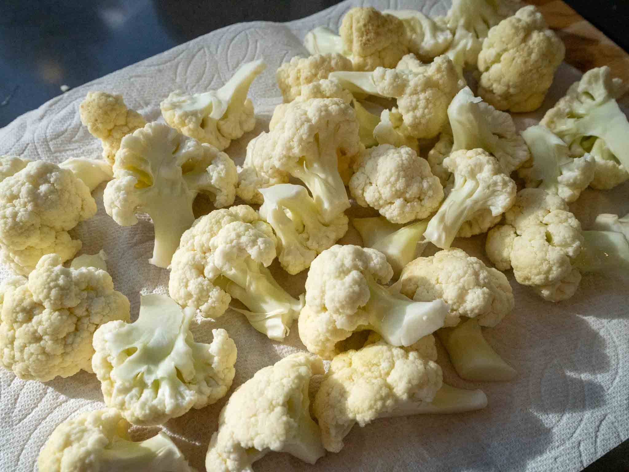 Cut the cauliflower head into large florets. Wash them to remove any dirt. Drain all the water and spread them on a paper towel to dry off. Pat with another paper towel to remove excess water.