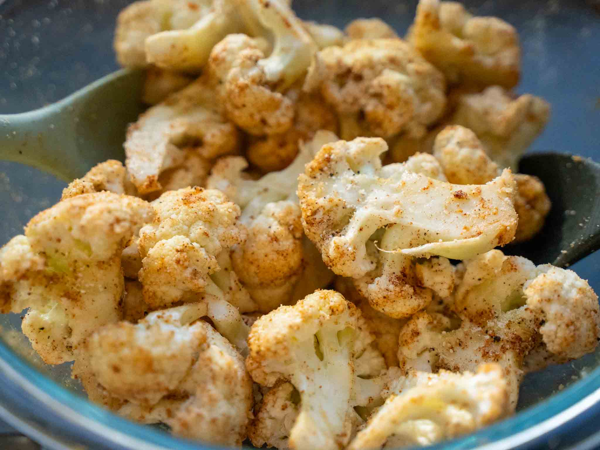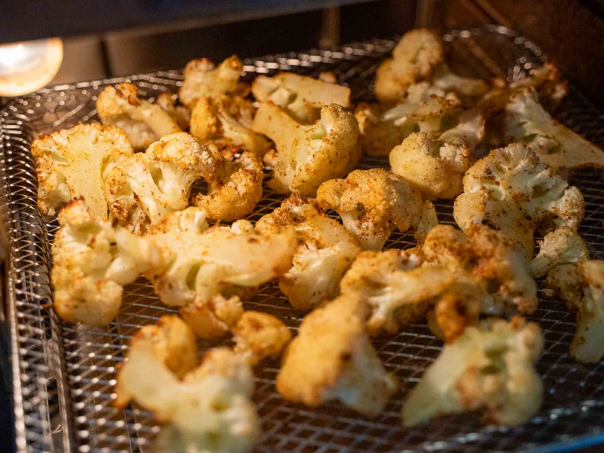 Cook them at 400°F for 12 minutes or until the edges of the cauliflower florets start turning golden brown. Make sure to flip them halfway through for even browning.
